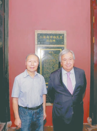 2024年9月3日,苏智良(左)在安全区旧址接待联合国秘书长古特雷斯先生。