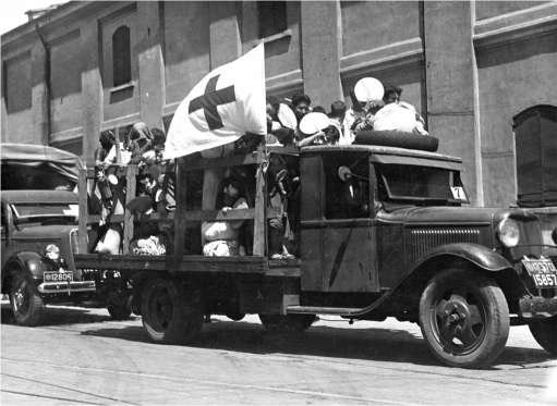 卡车上是满满一车难民,他们刚从战区撤出,正开往南市安全区。上海市档案馆藏